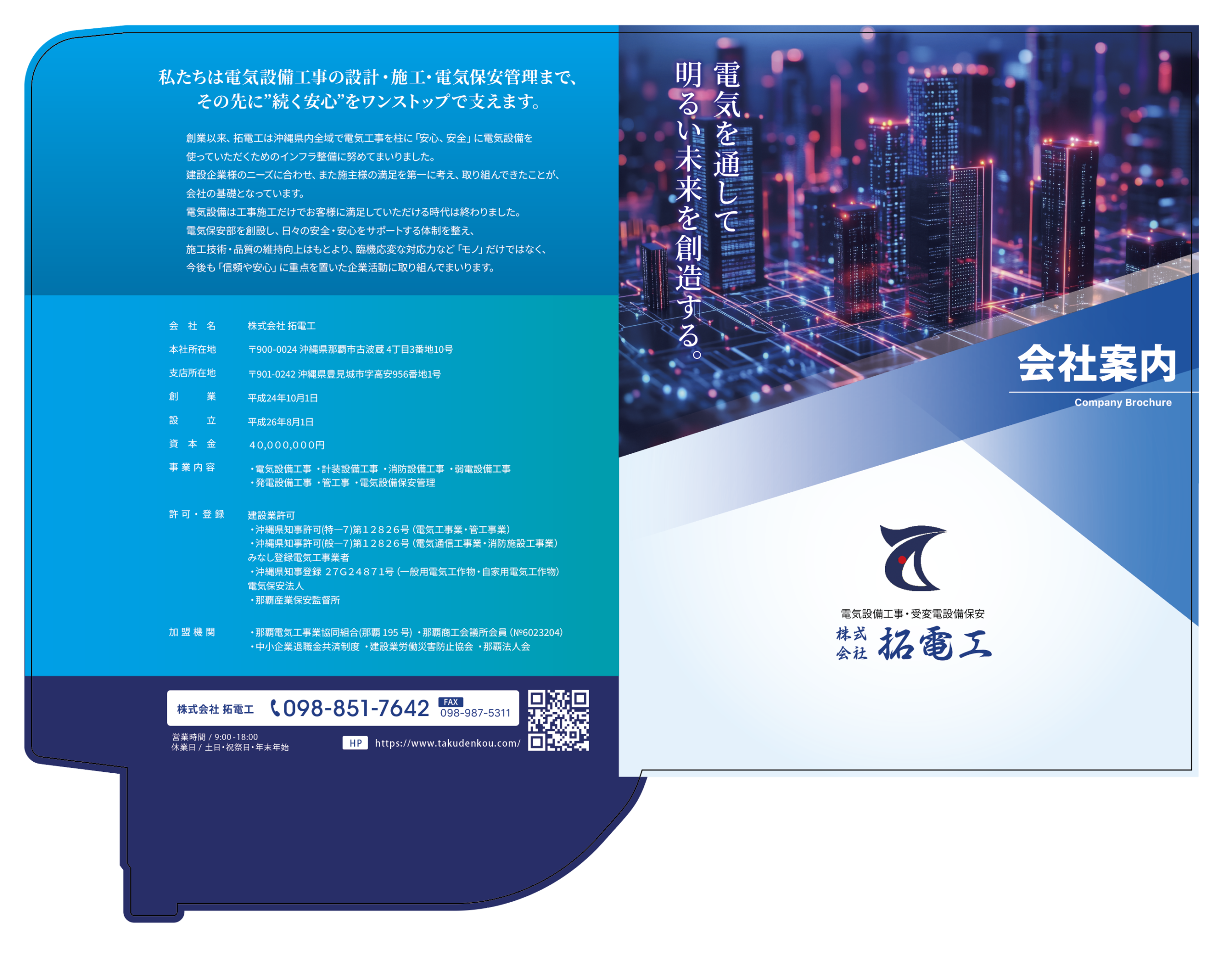 創業以来、拓電工は沖縄県内全域で電気工事を柱に「安心、安全」に電気設備を使っていただくためのインフラ整備に努めてまいりました。